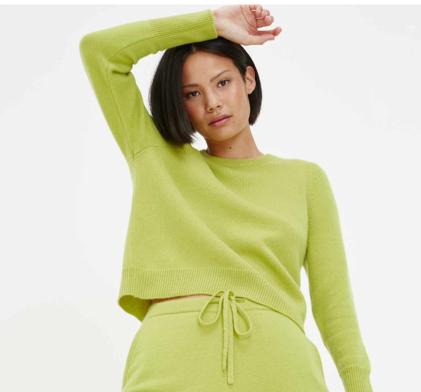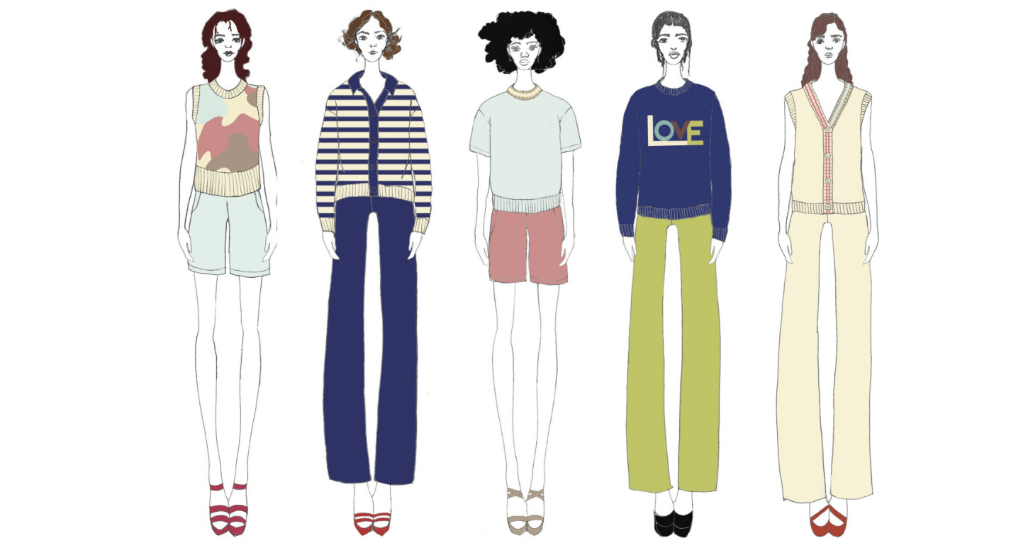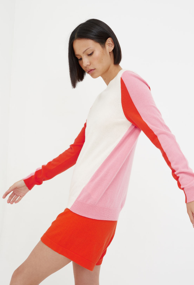 The colour palette is predictably bright but always easy to wear. Think cobalt blue, mint, and cream, enlivened by pops of red, fuchsia, and lime. Knitted short-sleeve tops and button- through vests are accented by textural collars and plackets in cool contrasting hues. This season’s Essentials – in pure cashmere, of course – complement the shades of the main collection.