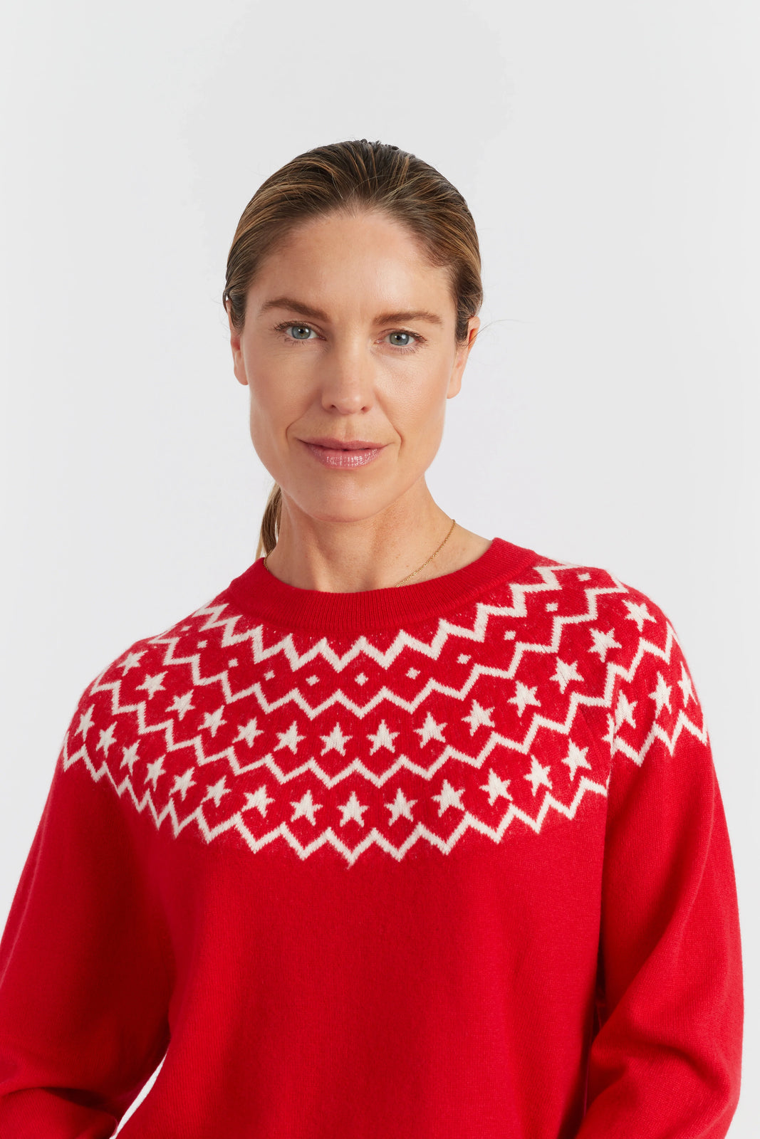 Bold and timeless. This red crewneck sweater is made from a luxurious cashmere blend and features a striking cream Fair Isle yoke. Its boxy silhouette lends a modern edge to this classic knit, making it a statement piece for cosy winter styling.