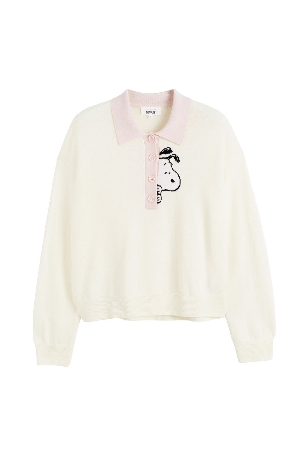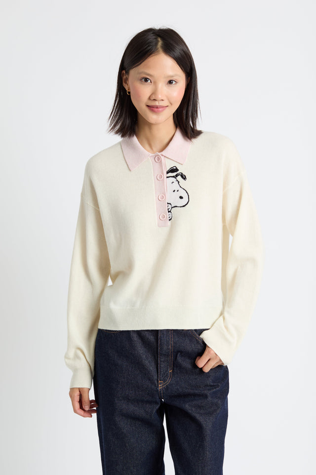 A playful spin on classic preppy style. Knitted from a soft wool and cashmere blend, this cream polo features an embroidered Snoopy motif at the chest and contrast grey trims. With its easy, relaxed silhouette and fine knit, it’s the perfect everyday layer with a joyful twist.