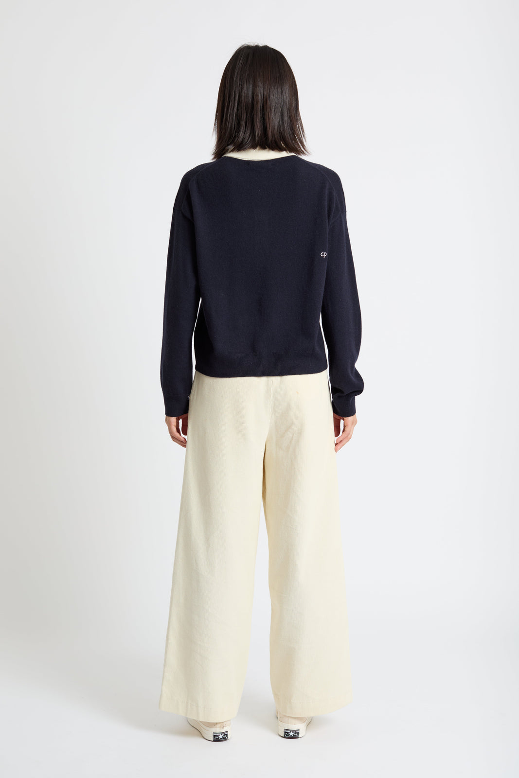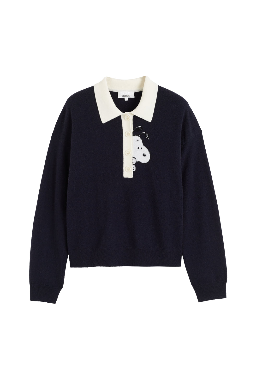 This navy polo sweater combines a sporty mood with luxurious comfort. Crafted from a fine wool-cashmere blend, it’s finished with a playful Snoopy embroidery and crisp white collar detailing. Lightweight yet warm, it’s an elevated essential that nods to nostalgia.