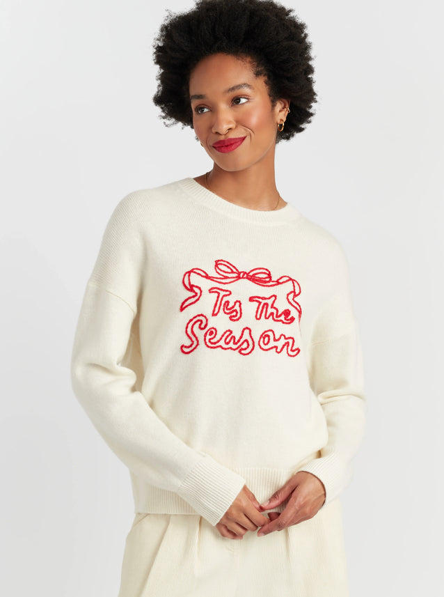 Woman wearing a cream sweater with 'Tis The Season' text in red on a white background