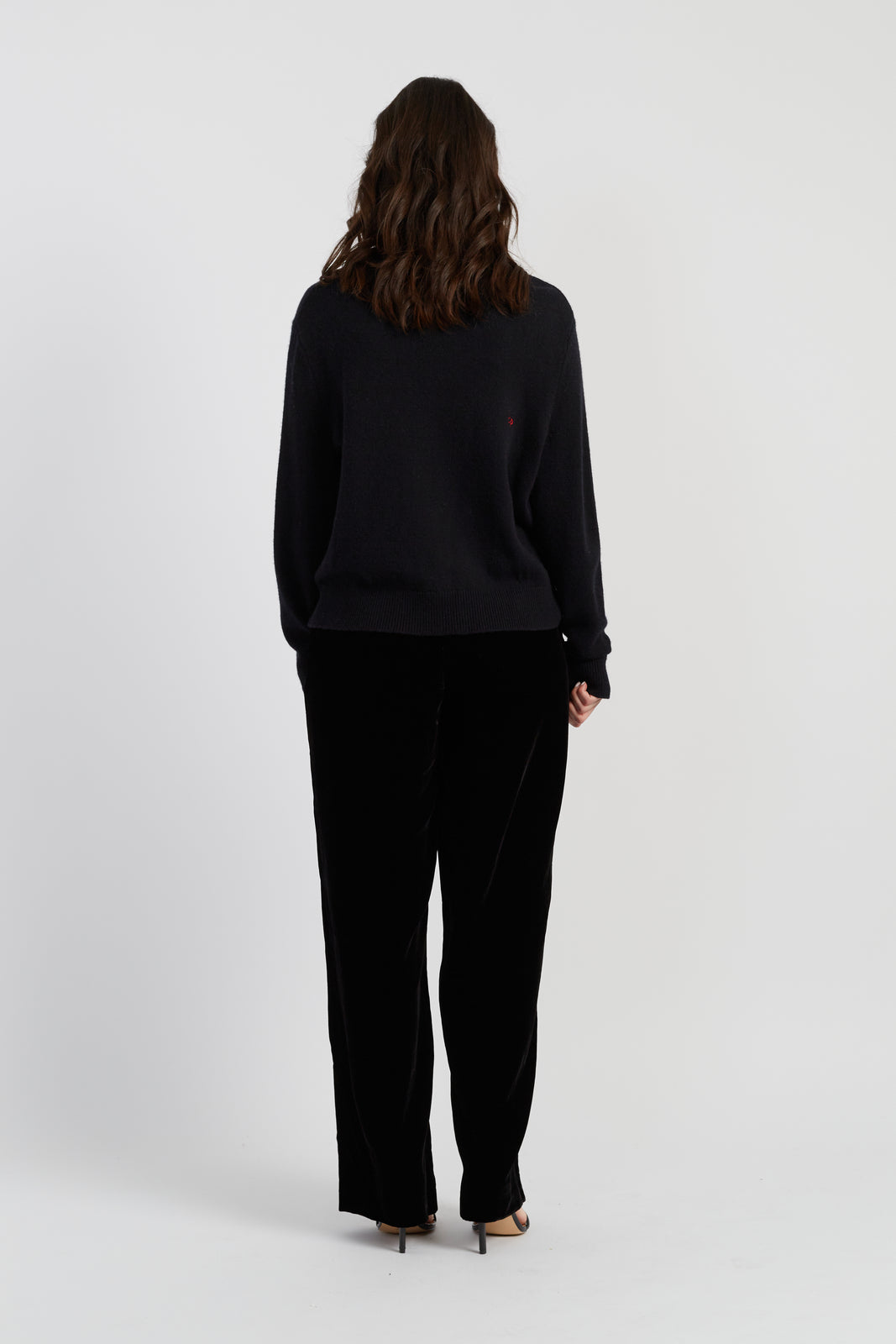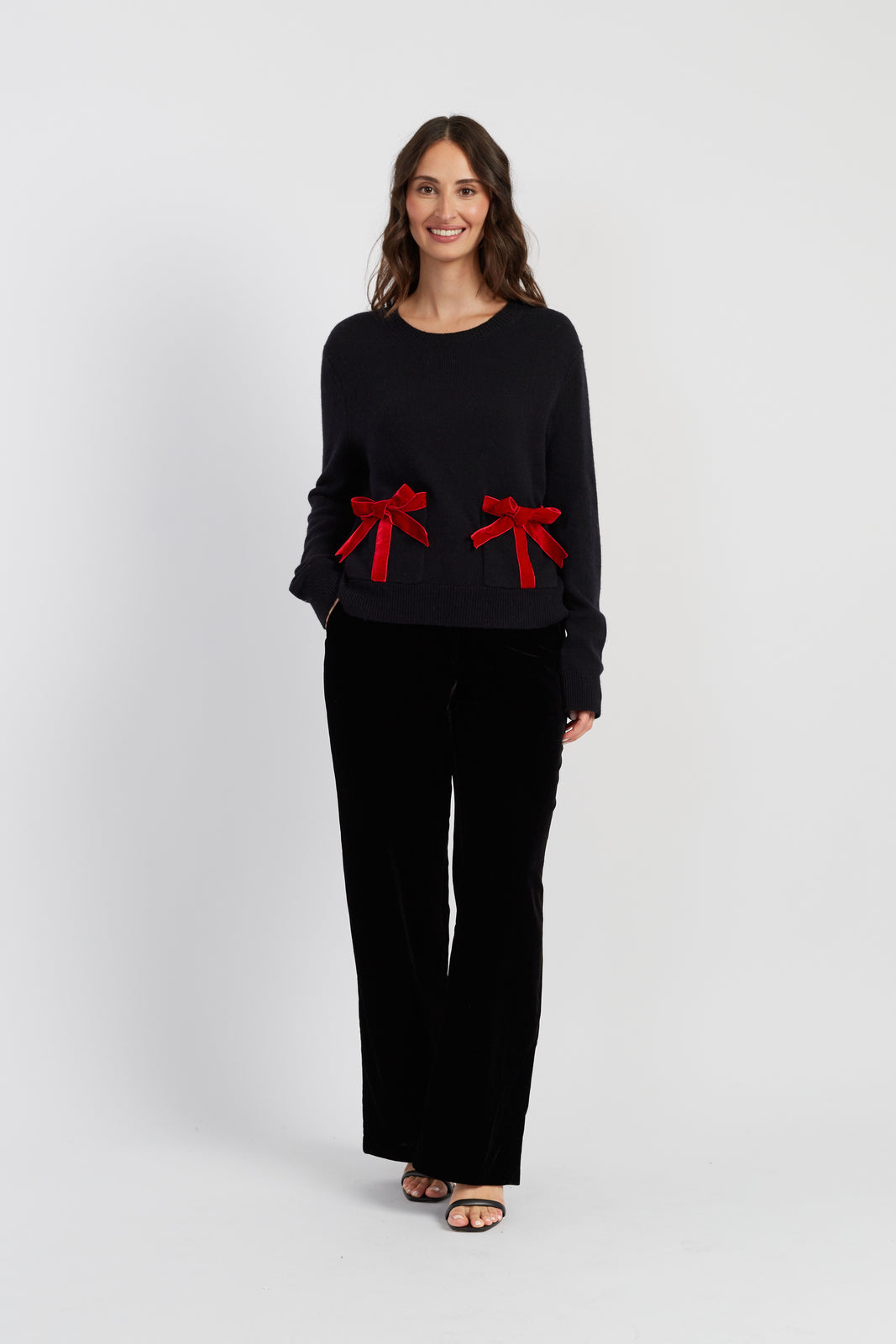 The sweetest knit of the season. This black crew neck jumper is made from our signature wool and cashmere blend, featuring two front pockets trimmed with red velvet bows — as if you've wrapped yourself up for Christmas.