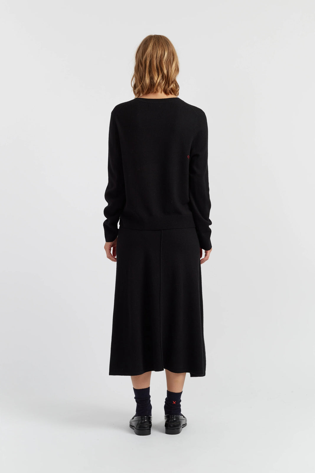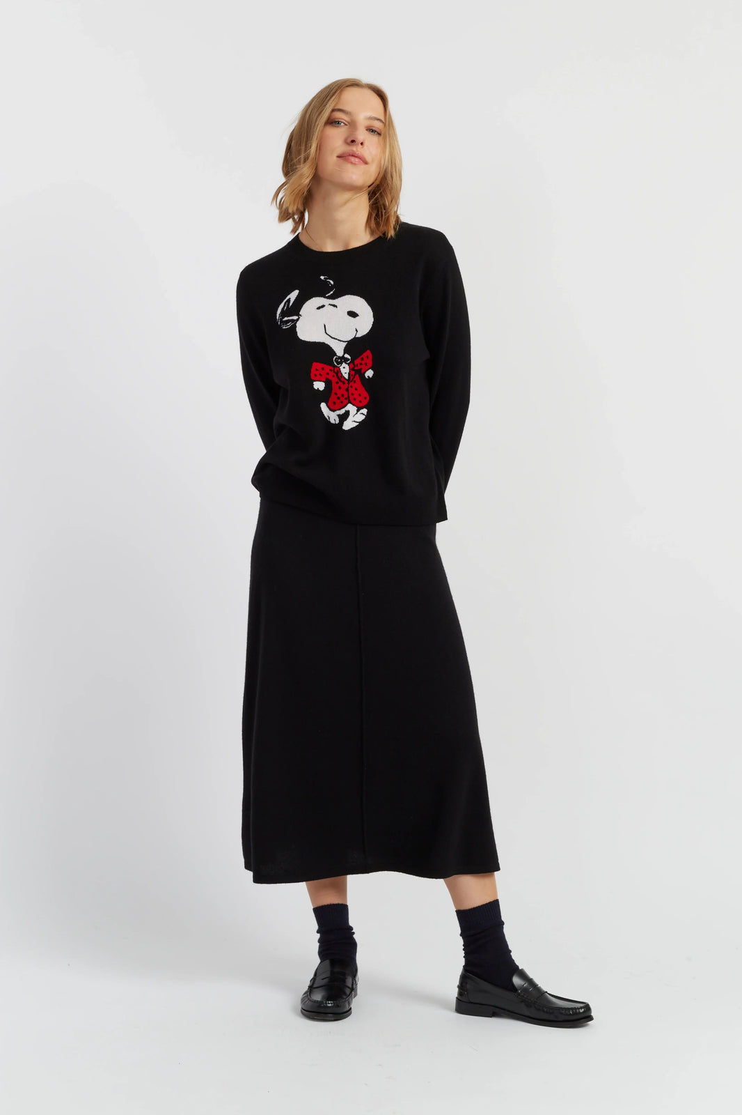 A joyful twist on winter knitwear, this black crew neck sweater celebrates everyone's favourite beagle in motion. Crafted from a luxurious wool and cashmere blend, it features an oversized dancing Snoopy motif front and centre — playful, bold, and irresistibly soft.
