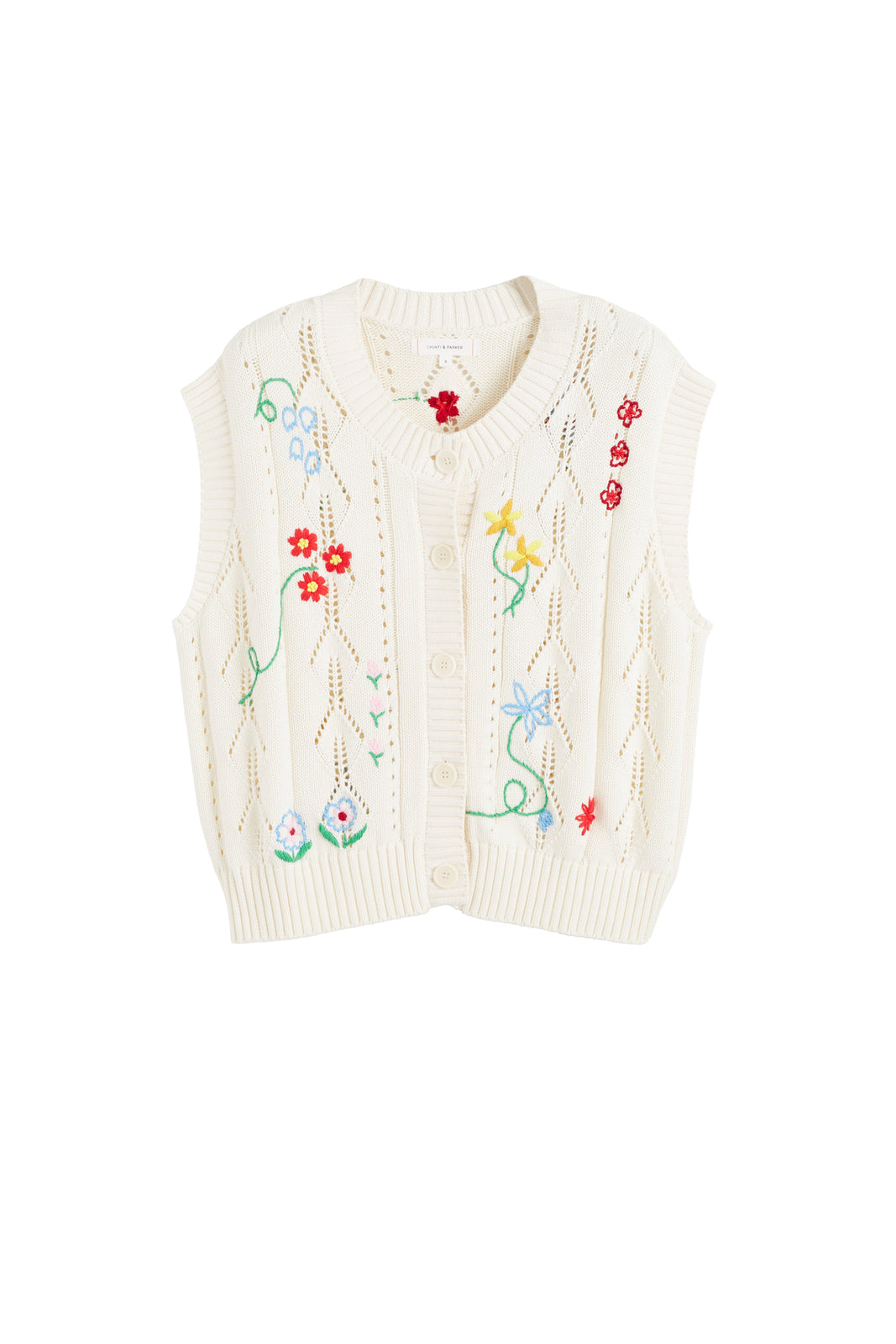 This sleeveless knit vest in soft cotton is adorned with delicate hand embroidery, bringing a playful, homespun feel to your everyday look. Designed in a lighter 5GG gauge, it’s perfect for layering over shirts or dresses as the seasons shift.