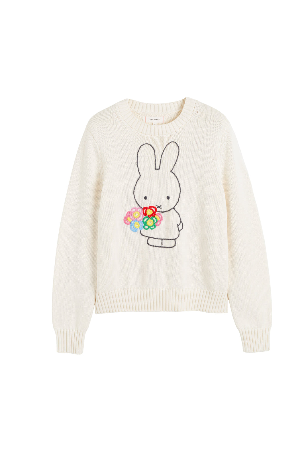 Artisanal craftsmanship meets childhood nostalgia in this cream cotton sweater, featuring a beautifully hand-embroidered Miffy holding a bouquet. With its chunky knit and gently relaxed fit, it brings a soft, joyful elegance to spring layering.