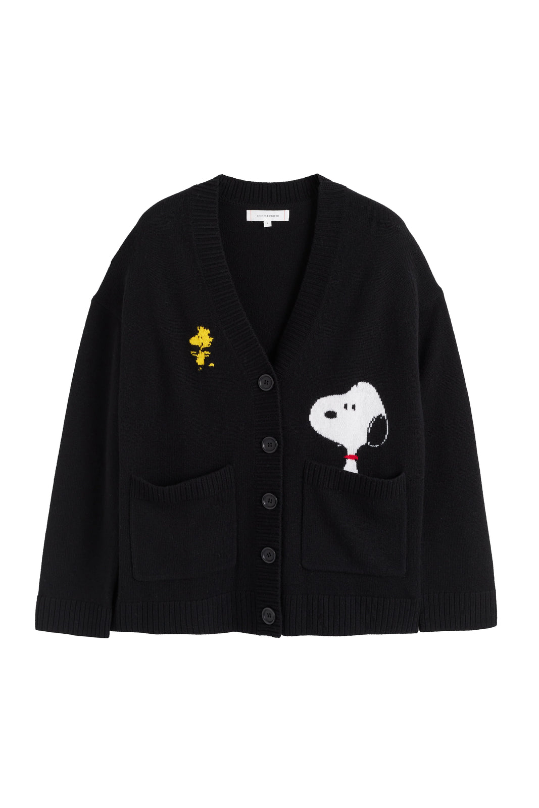 Every detail of this cardigan is designed to delight — from the soft wool-cashmere blend to the playful duo of Snoopy and Woodstock peeking from the patch pockets. A relaxed silhouette and black base make it an easy, feel-good favourite.