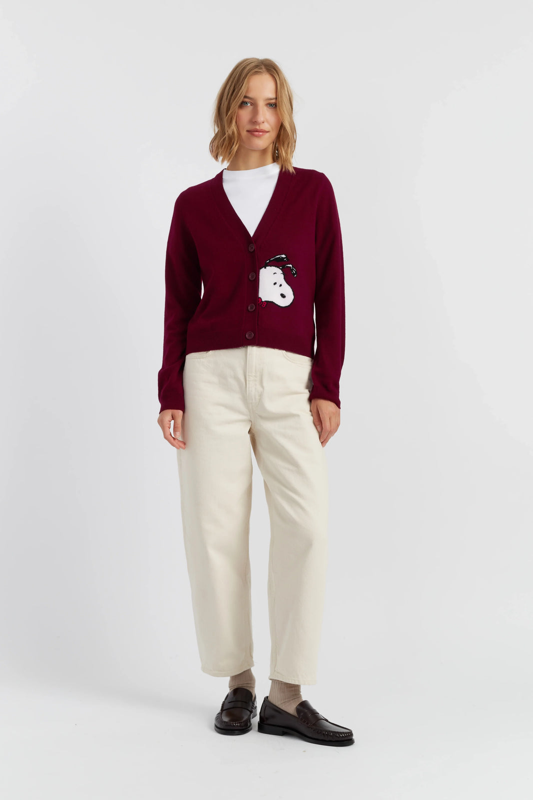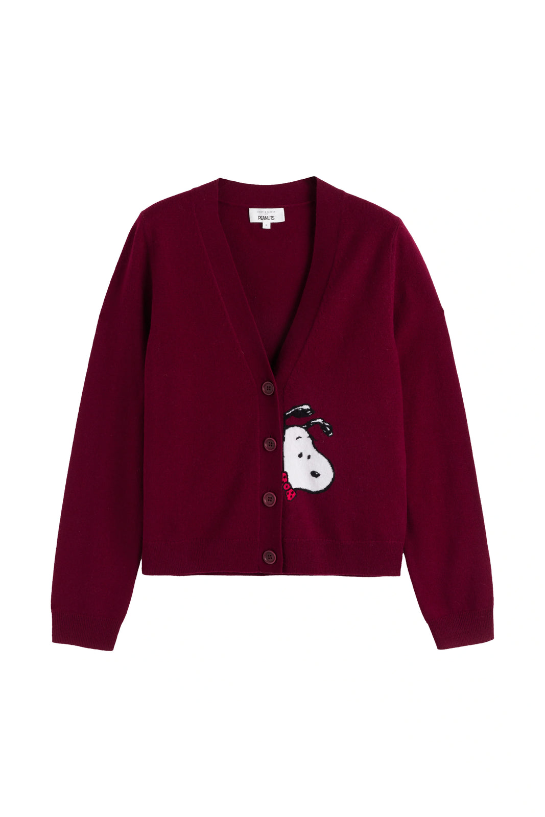 Understated with a hint of charm, this deep mulberry cardigan features Snoopy peeking out from the hem — a subtle nod to playful nostalgia. Knitted from our signature wool and cashmere blend, it offers an ultra-soft feel with timeless elegance.