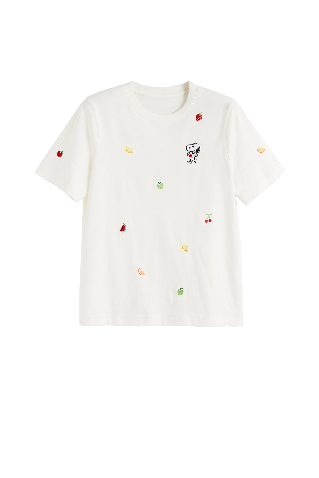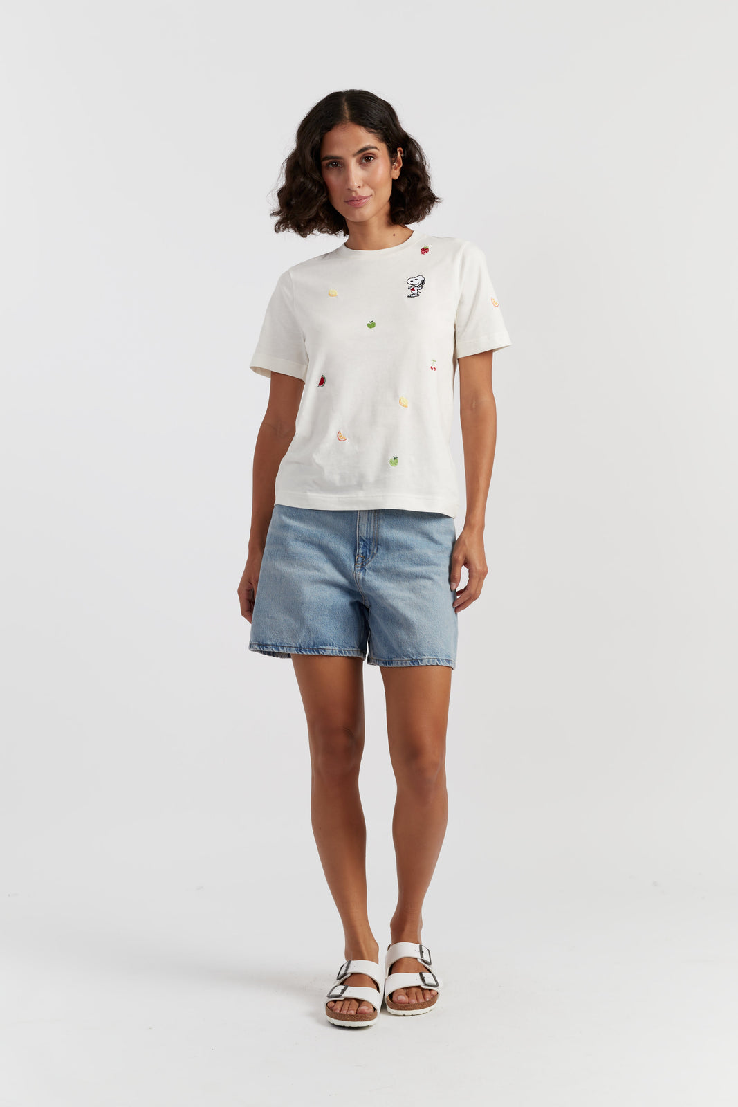 Crafted from soft cotton, this Cream tee features all-over Snoopy and fruit embroidery. Designed in a classic fit, it’s perfect for everyday wear. Pair with matching shorts or denim for a playful, elevated set.