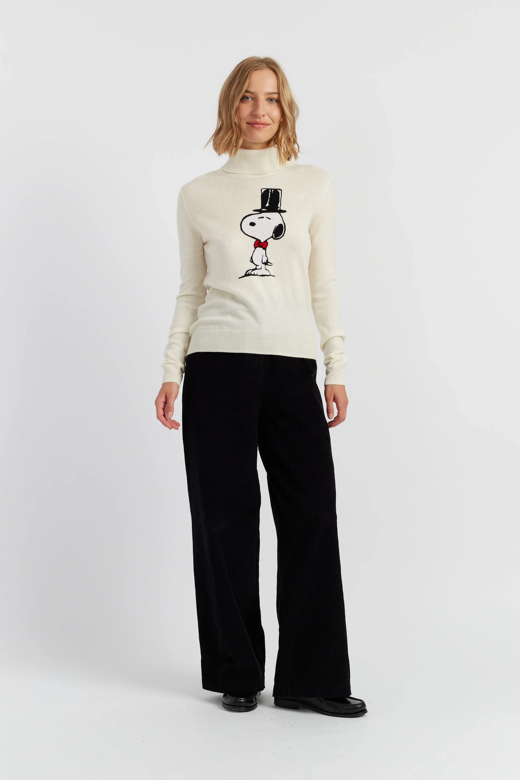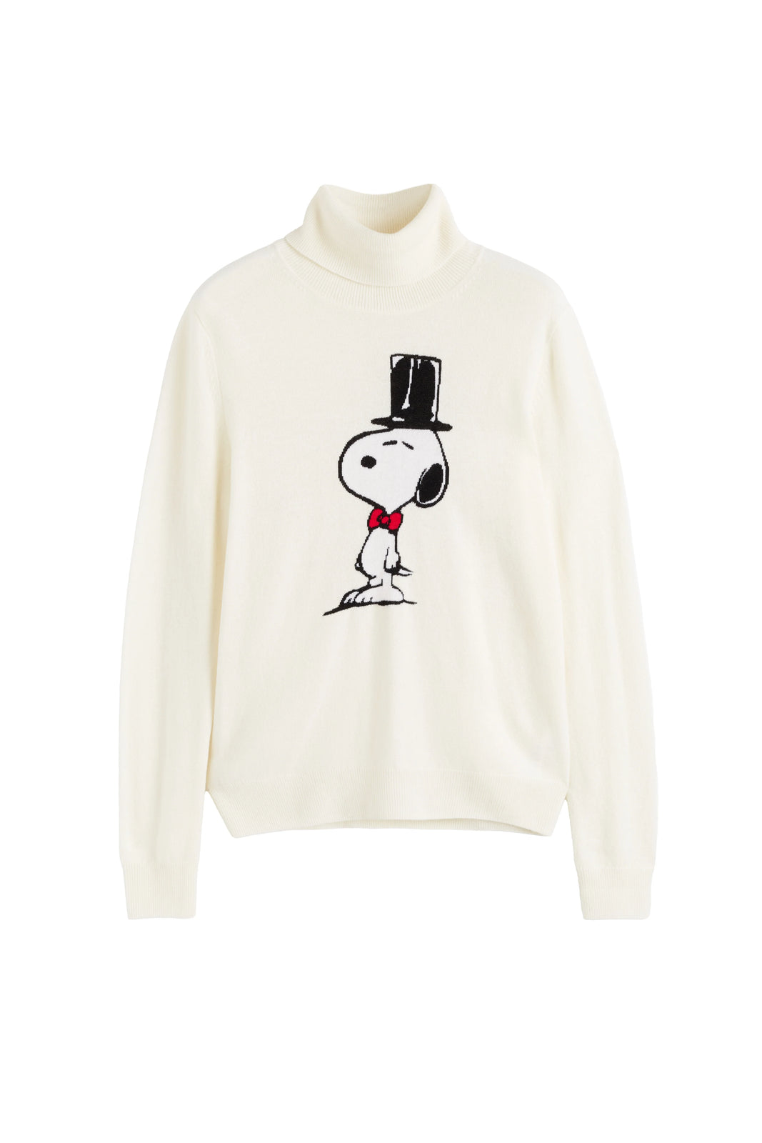 Elevate your knitwear with a touch of charm and humour. This cream roll neck sweater features a dapper Snoopy in a top hat and bow tie — the perfect blend of luxury and playfulness. Knitted from a sumptuous wool and cashmere blend, it's as soft and warm as it is fun to wear.