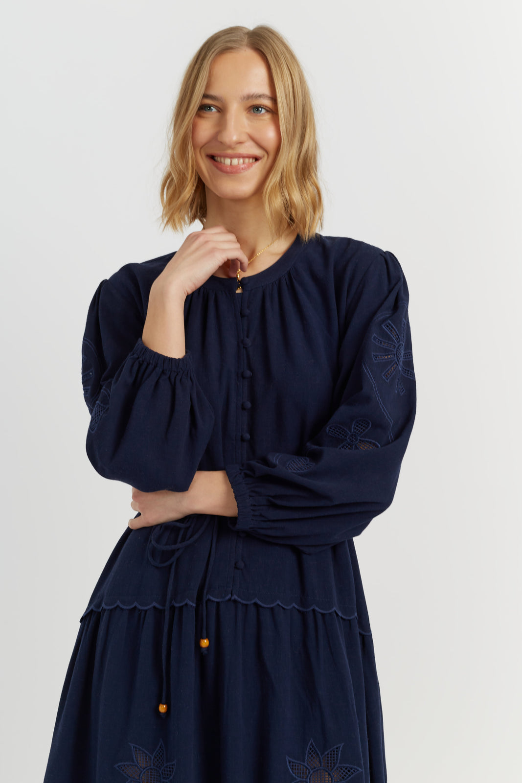 Exquisite Navy Broderie Dress, crafted from breathable, premium linen-blend fabric for a graceful, effortless drape. Intricate floral embroidery adds timeless elegance, while a matching fabric belt cinches the waist for a flattering fit. The flowing long skirt and billowing sleeves create classic fit, finished with wooden bead cord ends for artisanal charm. Perfect for sunny days or elegant evenings, it blends comfort, sophistication, and subtle statement-making detail in one refined piece.