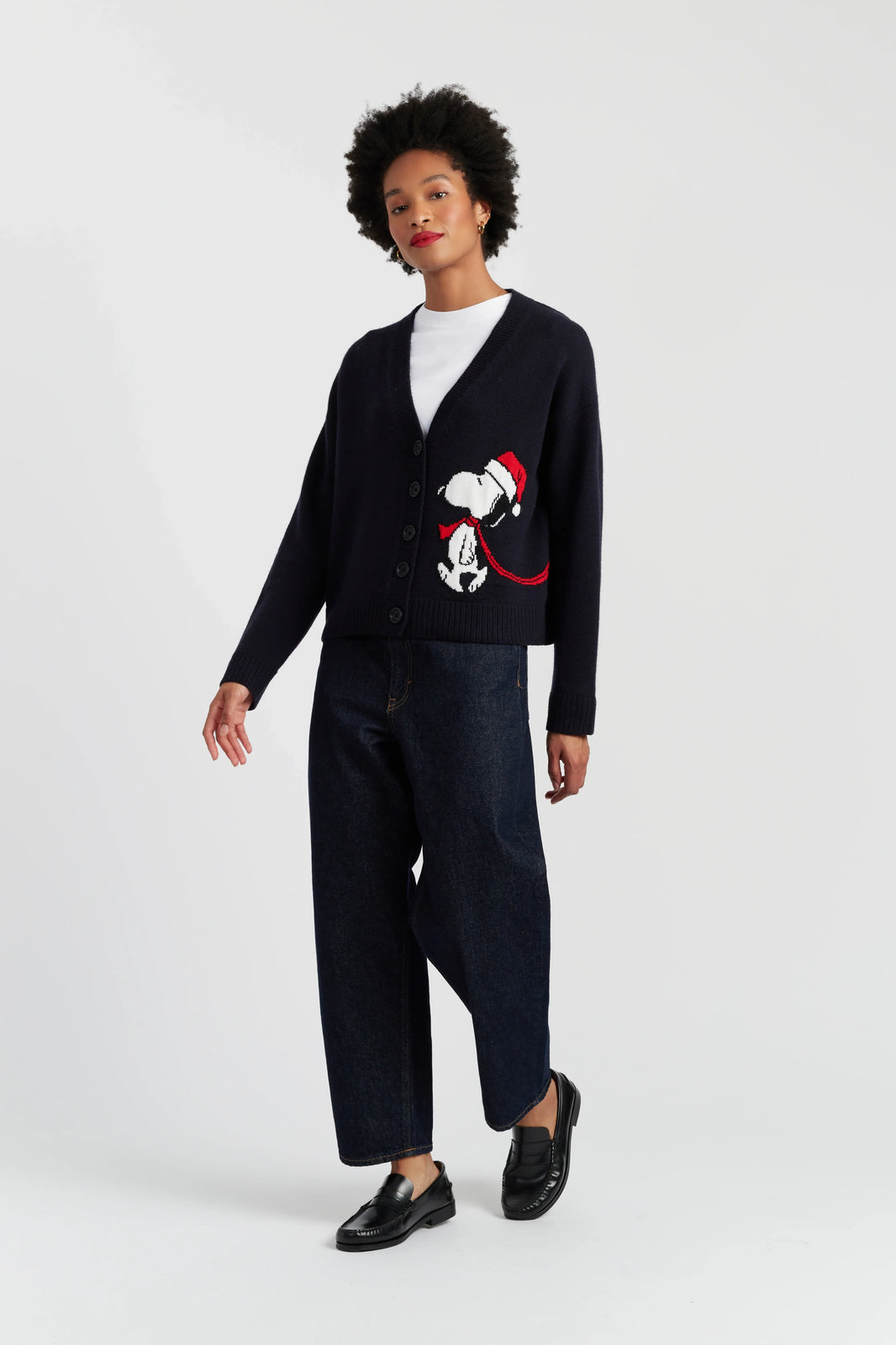 The Navy Wool-Cashmere Holiday Snoopy Cardigan is a Relaxed.